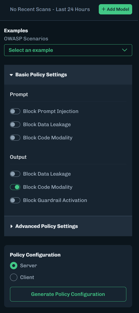 The LLM Sandbox in the HiddenLayer platform can be used to test and export examples of policy configurations. The following example shows how to configure a policy to block code modality on the input and output of the LLM, to test that the settings work as expected, and to copy or download the resulting policy from the UI.