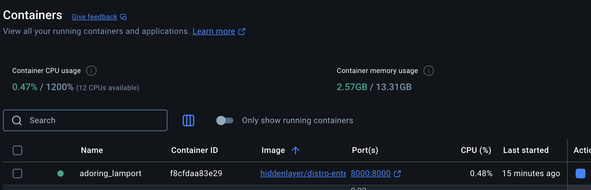 Note: Since we did not explicitly name the containers, Docker has probably given it a random adjective_scientist name; what’s important is that the image is correct and the ports are configured 8000:8000 so it can be accessed under