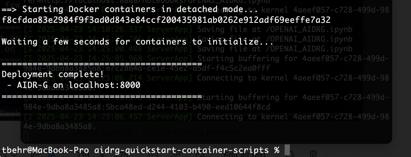 #!/usr/bin/env bash echo "=========================================" echo "Ollama + AIDR-GenAI Proxy Deployment" echo "=========================================" # Change to script's directory so everything is relative cd "$(dirname "$0")" if [ -z "$QUAY_USERNAME" ] || [ -z "$QUAY_PASSWORD" ] || [ -z "$HL_LICENSE" ]; then echo "Error: Missing QUAY_USERNAME, QUAY_PASSWORD, or HL_LICENSE environment variables." exit 1 fi echo "=== Deploy Script ===" echo "Using Quay.io username: $QUAY_USERNAME" # (Don't echo the password for security reasons!) echo "Using HL_LICENSE STARTING WITH: ${HL_LICENSE::10}..." echo "" echo "$QUAY_PASSWORD" | docker login quay.io --username "$QUAY_USERNAME" --password-stdin # Generate docker-compose file cat <<EOF > docker-compose-ollama.yml services: ollama: image: ollama/ollama container_name: ollama ports: - "11434:11434" volumes: - ollama:/root/.ollama restart: unless-stopped ai-service: image: quay.io/hiddenlayer/distro-enterprise-aidr-genai container_name: ai-service ports: - "8000:8000" environment: - HL_LLM_PROXY_MLDR_CONNECTION_TYPE=disabled - HL_LICENSE=${HL_LICENSE} - HL_LLM_PROXY_MLDR_BASE_URL=https://api.<eu|us>.hiddenlayer.ai - HL_LLM_PROXY_CLIENT_ID=${HL_CLIENT_ID} - HL_LLM_PROXY_CLIENT_SECRET=${HL_CLIENT_SECRET} - HL_LLM_PROXY_CUSTOM_LLAMA=tinyllama - HL_LLM_PROXY_CUSTOM_LLAMA_PROVIDER=ollama - HL_LLM_PROXY_CUSTOM_LLAMA_BASE_URL=http://ollama:11434 platform: linux/amd64 restart: unless-stopped volumes: ollama: EOF echo "==> Created docker-compose-ollama.yml" # Pull images echo "" echo "==> Pulling images (ollama/ollama and quay.io/hiddenlayer/distro-enterprise-aidr-genai)..." docker pull ollama/ollama docker pull quay.io/hiddenlayer/distro-enterprise-aidr-genai # Start containers echo "" echo "==> Starting Docker containers in detached mode..." docker compose -f docker-compose-ollama.yml up -d echo "" echo "Waiting a few seconds for containers to initialize..." sleep 5 # Initialize 'tinyllama' inside Ollama echo "" echo "Running and testing 'ollama run tinyllama'..." echo "Repeat after me: Test Complete" | docker compose -f docker-compose-ollama.yml exec -T ollama ollama run tinyllama || { echo "WARNING: 'ollama run tinyllama' failed. You may need to configure or download the model." } echo "" echo "=======================================" echo "Deployment complete!" echo " - Ollama running at localhost:11434" echo " - AIDR-G on localhost:8000" echo "=======================================" echo "" echo "" echo "Now streaming logs for 'ai-service' only." echo "" echo "" docker compose -f docker-compose-ollama.yml logs --tail=0 -f ai-service \ | sed GBefore running the updated deployment script, make sure that your environment variables contain the 5 below (you should have set all of them in previous tutorials, but in case you have not yet, make sure to do so now, as the deployment script will not run successfully without them: