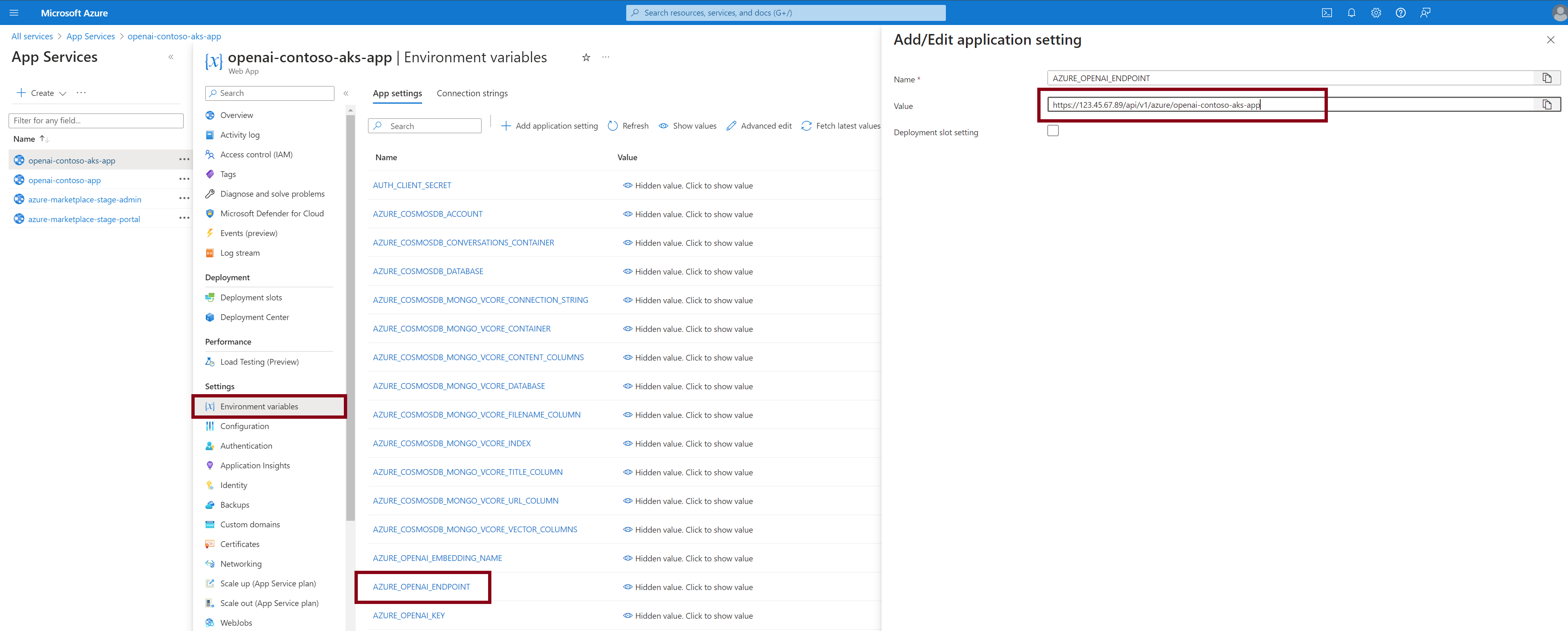 Find the setting for AZURE_OPENAI_ENDPOINT, click on the name, then modify its value: