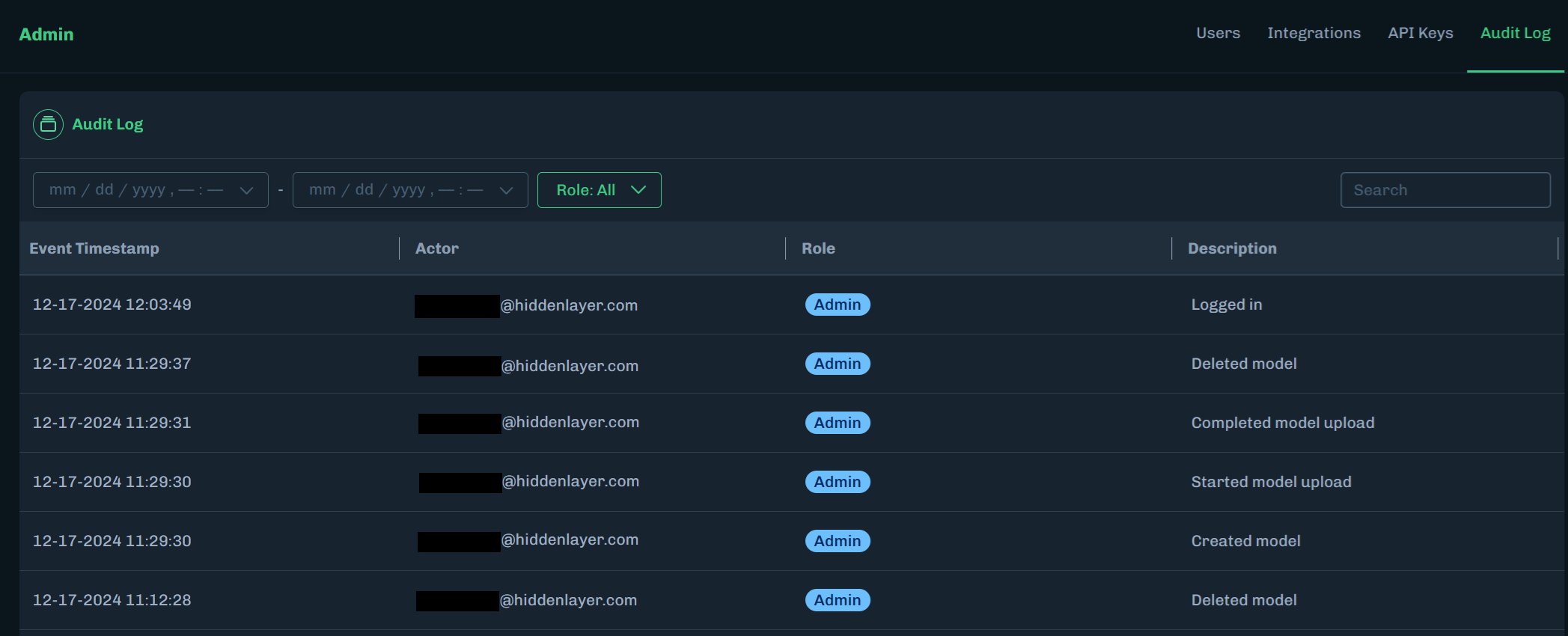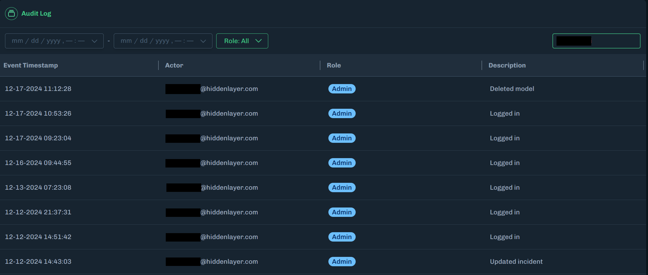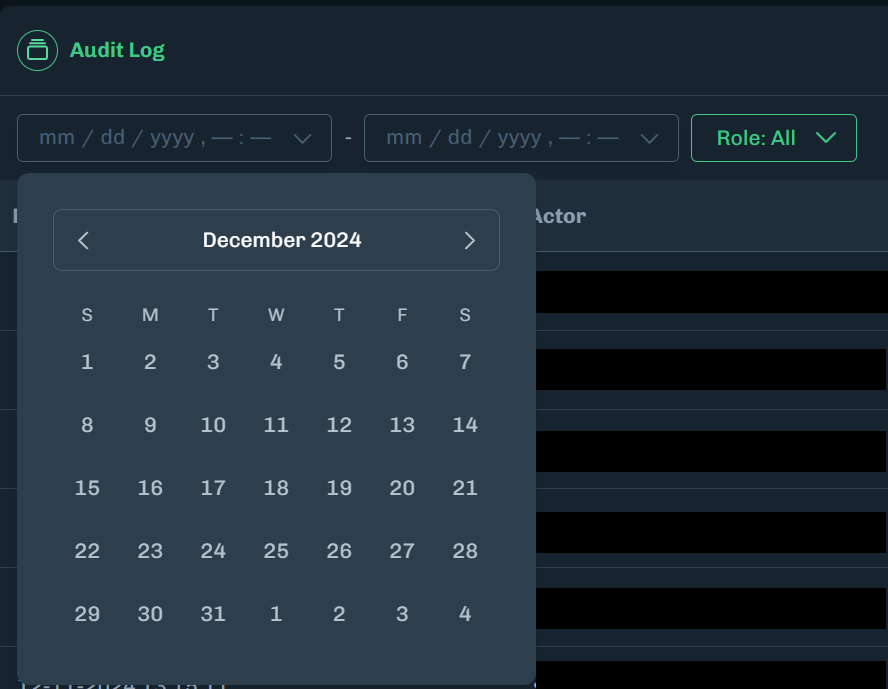 Select a start date and end date to display audit log activity that occurred within the selected dates.