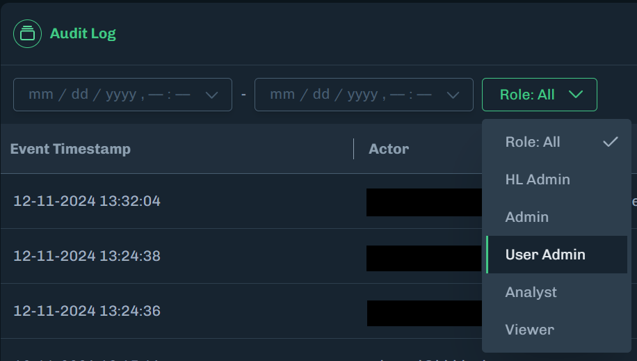 Select a role to display audit log activity based on a user’s assigned role.
