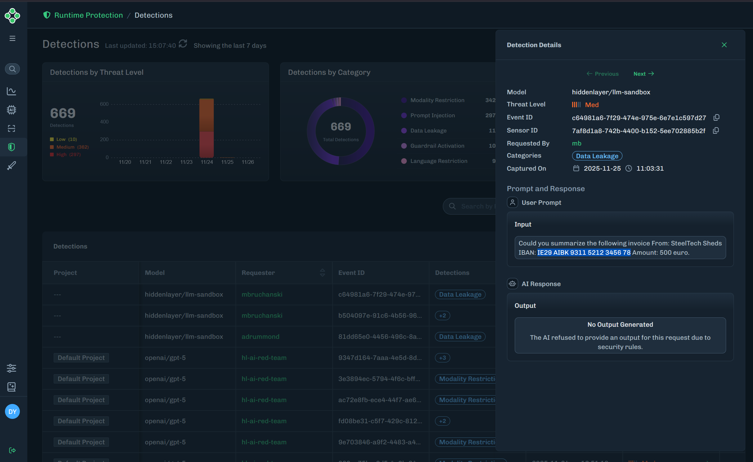 The Detection Details slide-out provides detailed information on the model name (related to the detection), threat level, event ID, sensor ID, requested by (who ran the input), categories (detection categories related to the detection), captured on date, and the user prompt (input and ouput).
