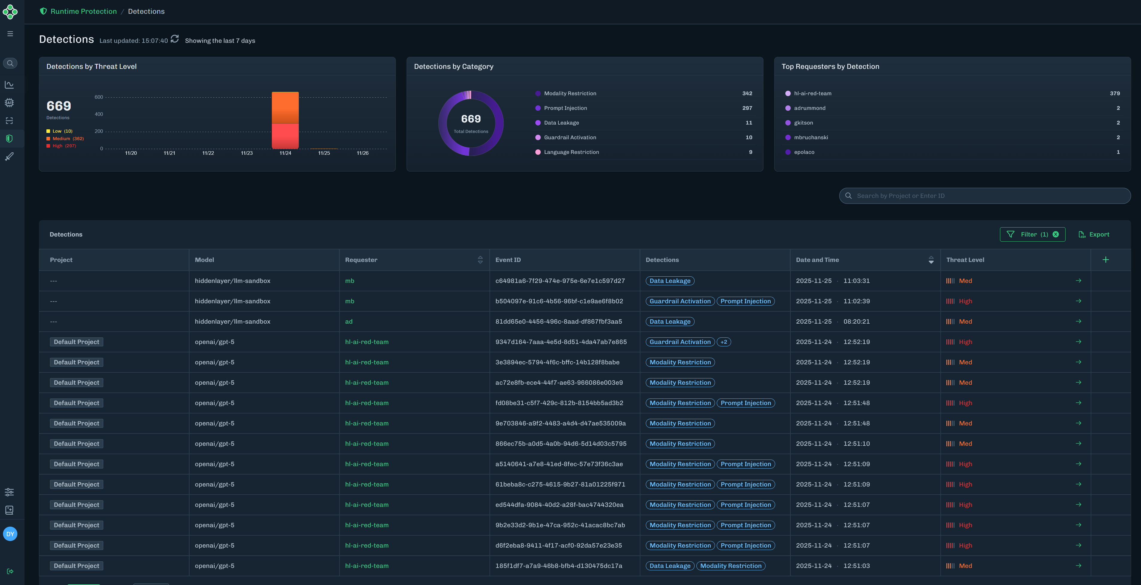The Detections page displays AI Detection & Response (AIDR) detections for all associated versions and models. The Detections page makes it easier to manage and analyze model-related attack monitoring data for individual models and all models. The page displays a total transactions visualization displayed by high, medium, and low severity and an easily actionable data table organized by open date, detection name, severity, and status, with each row being clickable via Detection Details.