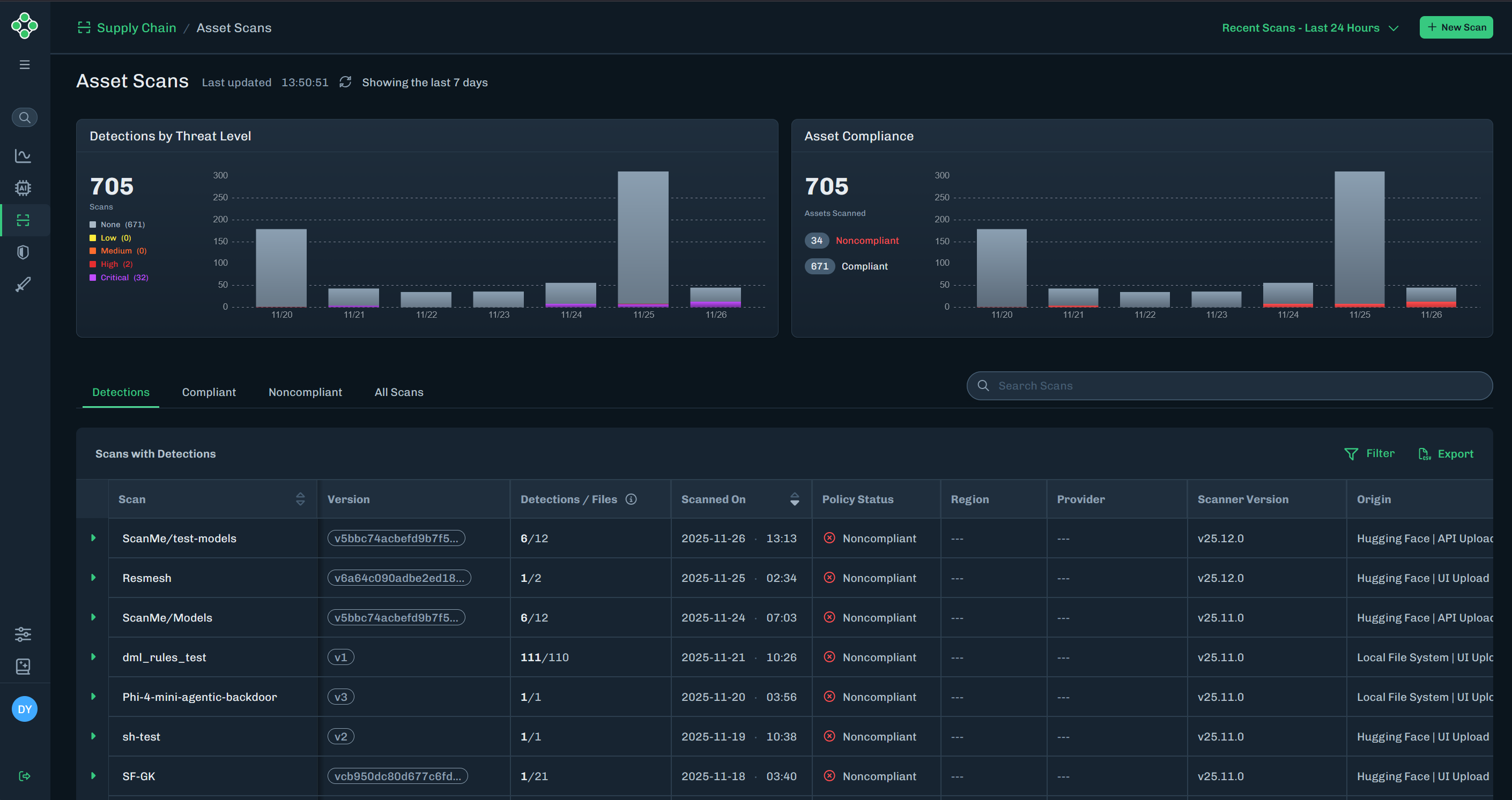 As organizations adopt AI systems, they often lack visibility into the models, datasets, and third-party components that power them, introducing operational, security, and compliance risks. Supply Chain does this by utilizing HiddenLayer's Model Scanner and related policies.