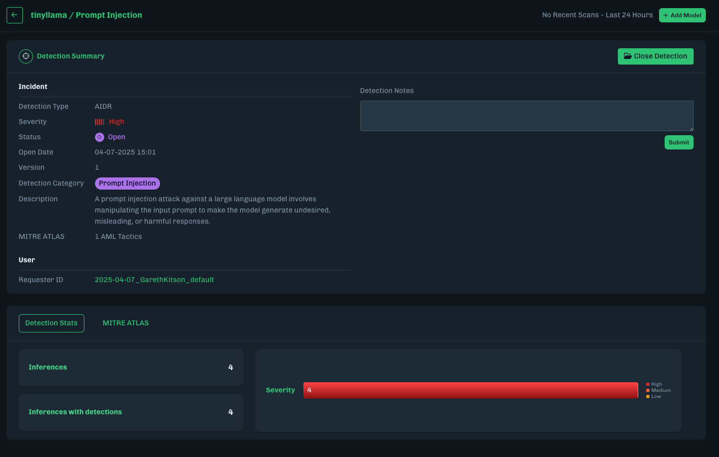 /bin/bash deploy.shOnce deployment is completed, when you run the Python script to send a request to the LLM proxy, you should be able to see the detection results in the cloud console within your tenant.