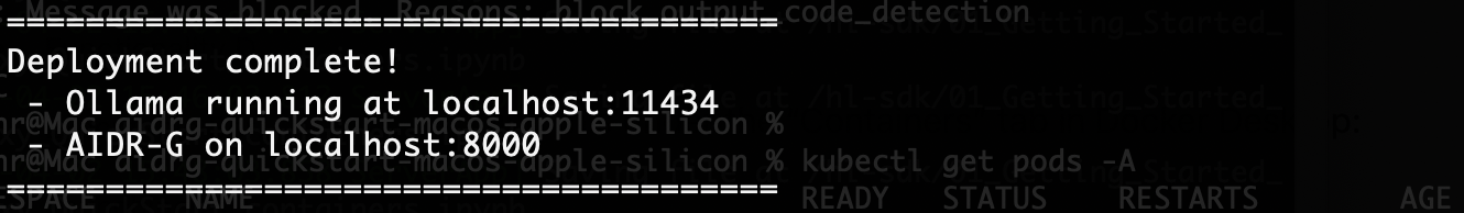 #!/usr/bin/env bash echo "=========================================" echo "Ollama + Runtime Security Proxy Deployment" echo "=========================================" # Change to script's directory so everything is relative cd "$(dirname "$0")" if [ -z "$QUAY_USERNAME" ] || [ -z "$QUAY_PASSWORD" ] || [ -z "$HL_LICENSE" ]; then echo "Error: Missing QUAY_USERNAME, QUAY_PASSWORD, or HL_LICENSE environment variables." exit 1 fi echo "=== Deploy Script ===" echo "Using Quay.io username: $QUAY_USERNAME" # (Don't echo the password for security reasons!) echo "Using HL_LICENSE STARTING WITH: ${HL_LICENSE::10}..." echo "" echo "$QUAY_PASSWORD" | docker login quay.io --username "$QUAY_USERNAME" --password-stdin # Generate docker-compose file cat <<EOF > docker-compose-ollama.yml services: ollama: image: ollama/ollama container_name: ollama ports: - "11434:11434" volumes: - ollama:/root/.ollama restart: unless-stopped ai-service: image: quay.io/hiddenlayer/distro-enterprise-aidr-genai container_name: ai-service ports: - "8000:8000" environment: - HL_LLM_PROXY_MLDR_CONNECTION_TYPE=disabled - HL_LICENSE=${HL_LICENSE} - HL_LLM_PROXY_MLDR_BASE_URL=https://api.<eu|us>.hiddenlayer.ai - HL_LLM_PROXY_CLIENT_ID=${HL_CLIENT_ID} - HL_LLM_PROXY_CLIENT_SECRET=${HL_CLIENT_SECRET} - HL_LLM_PROXY_CUSTOM_LLAMA=tinyllama - HL_LLM_PROXY_CUSTOM_LLAMA_PROVIDER=ollama - HL_LLM_PROXY_CUSTOM_LLAMA_BASE_URL=http://ollama:11434 platform: linux/amd64 restart: unless-stopped volumes: ollama: EOF echo "==> Created docker-compose-ollama.yml" # Pull images echo "" echo "==> Pulling images (ollama/ollama and quay.io/hiddenlayer/distro-enterprise-aidr-genai)..." docker pull ollama/ollama docker pull quay.io/hiddenlayer/distro-enterprise-aidr-genai # Start containers echo "" echo "==> Starting Docker containers in detached mode..." docker compose -f docker-compose-ollama.yml up -d echo "" echo "Waiting a few seconds for containers to initialize..." sleep 5 # Initialize 'tinyllama' inside Ollama echo "" echo "Running and testing 'ollama run tinyllama'..." echo "Repeat after me: Test Complete" | docker compose -f docker-compose-ollama.yml exec -T ollama ollama run tinyllama || { echo "WARNING: 'ollama run tinyllama' failed. You may need to configure or download the model." } echo "" echo "=======================================" echo "Deployment complete!" echo " - Ollama running at localhost:11434" echo " - Runtime Security on localhost:8000" echo "=======================================" echo "" echo "" echo "Now streaming logs for 'ai-service' only." echo "" echo "" docker compose -f docker-compose-ollama.yml logs --tail=0 -f ai-service \ | sed GBefore running the updated deployment script, make sure that your environment variables contain the 5 below (you should have set all of them in previous tutorials, but in case you have not yet, make sure to do so now, as the deployment script will not run successfully without them: