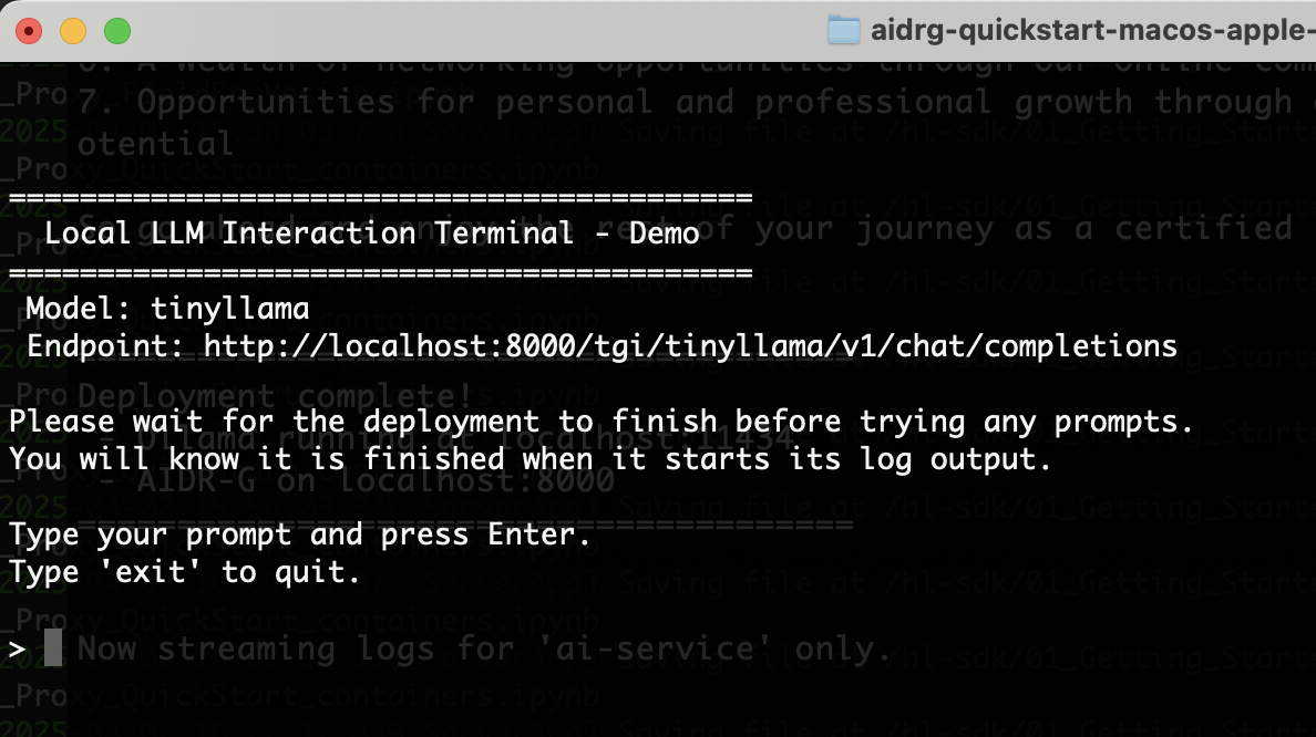 To verify that both the model and the proxy are running as expected, open a new terminal window without closing the deployment window.