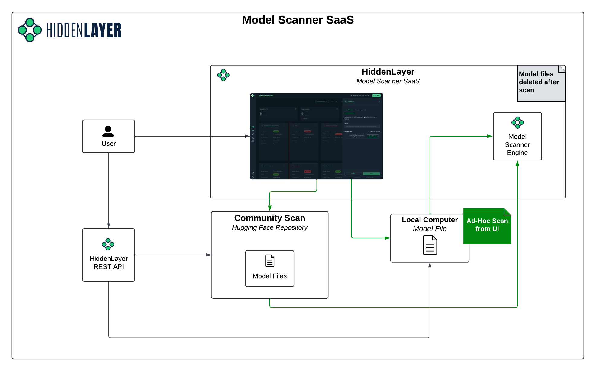 Supply Chain SaaS is designed for discrete scanning requests. You have the option to either upload a model file to the HiddenLayer Console or to send the model file to the SaaS endpoint (via HiddenLayer SDK or REST). The model file is then scanned by the Supply Chain, the results are returned to the Console and display in the your tenant. Because Supply Chain SaaS leverages the Supply Chain, you do not need to run any Supply Chain containers in your environment.